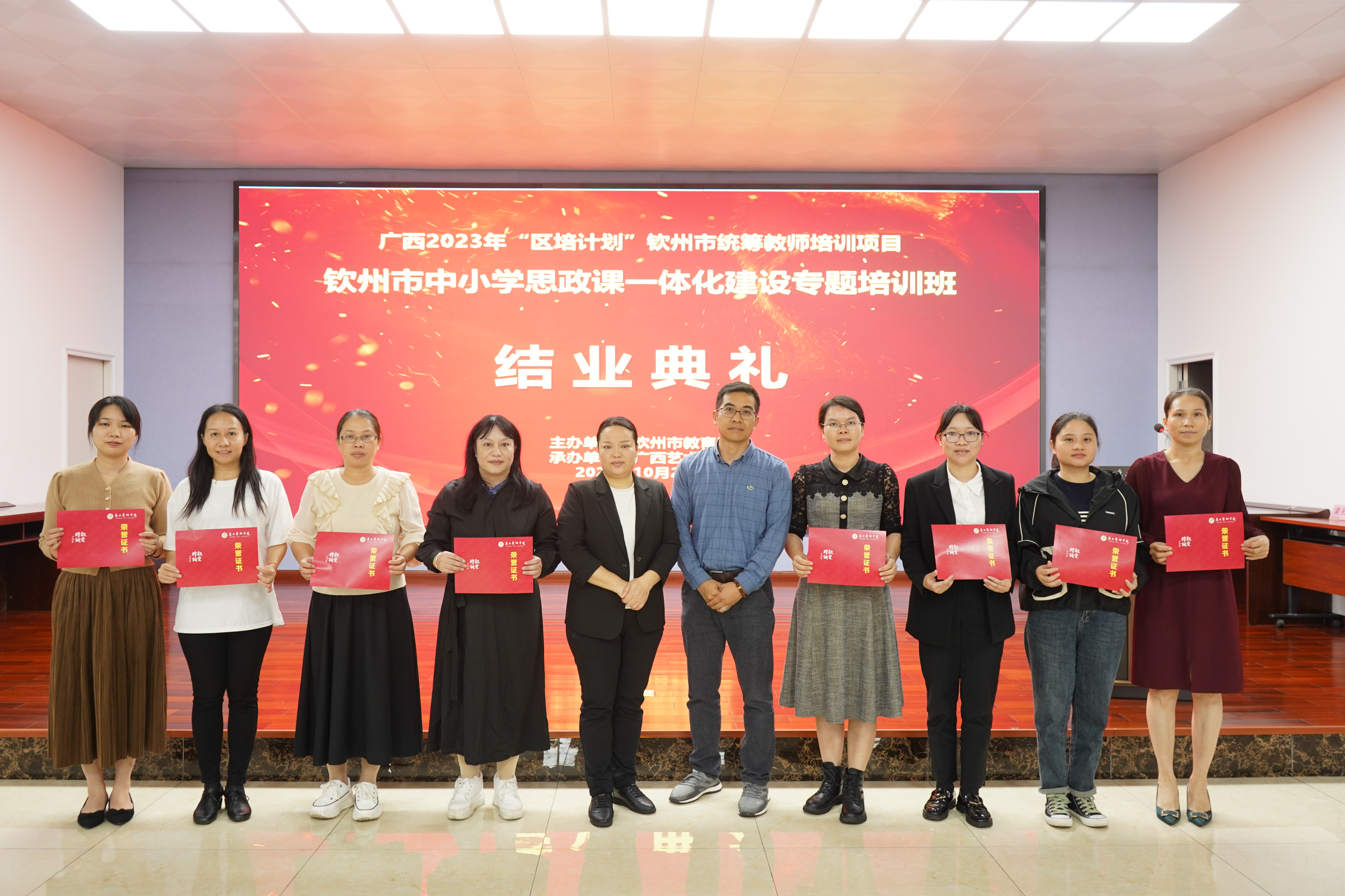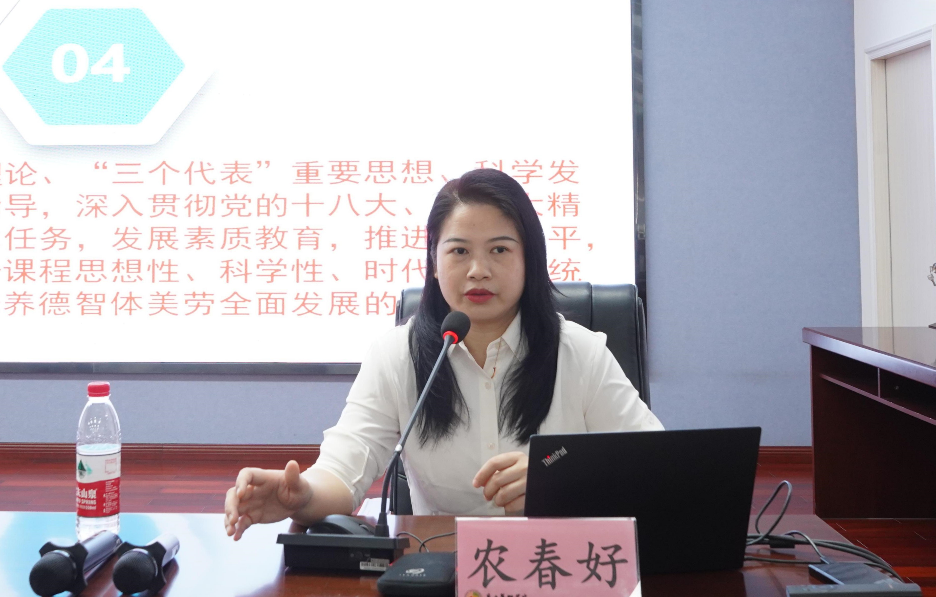 在钦州市中小学思政课一体化建设专题培训班结业典礼上,阳丁玉副科长和于毅荣科长分别对本次培训项目做了总结发言,同时,并为学员代表和优秀学员分别颁发了结业证书和荣誉证书。学员代表黄春燕做了学习体会发言。